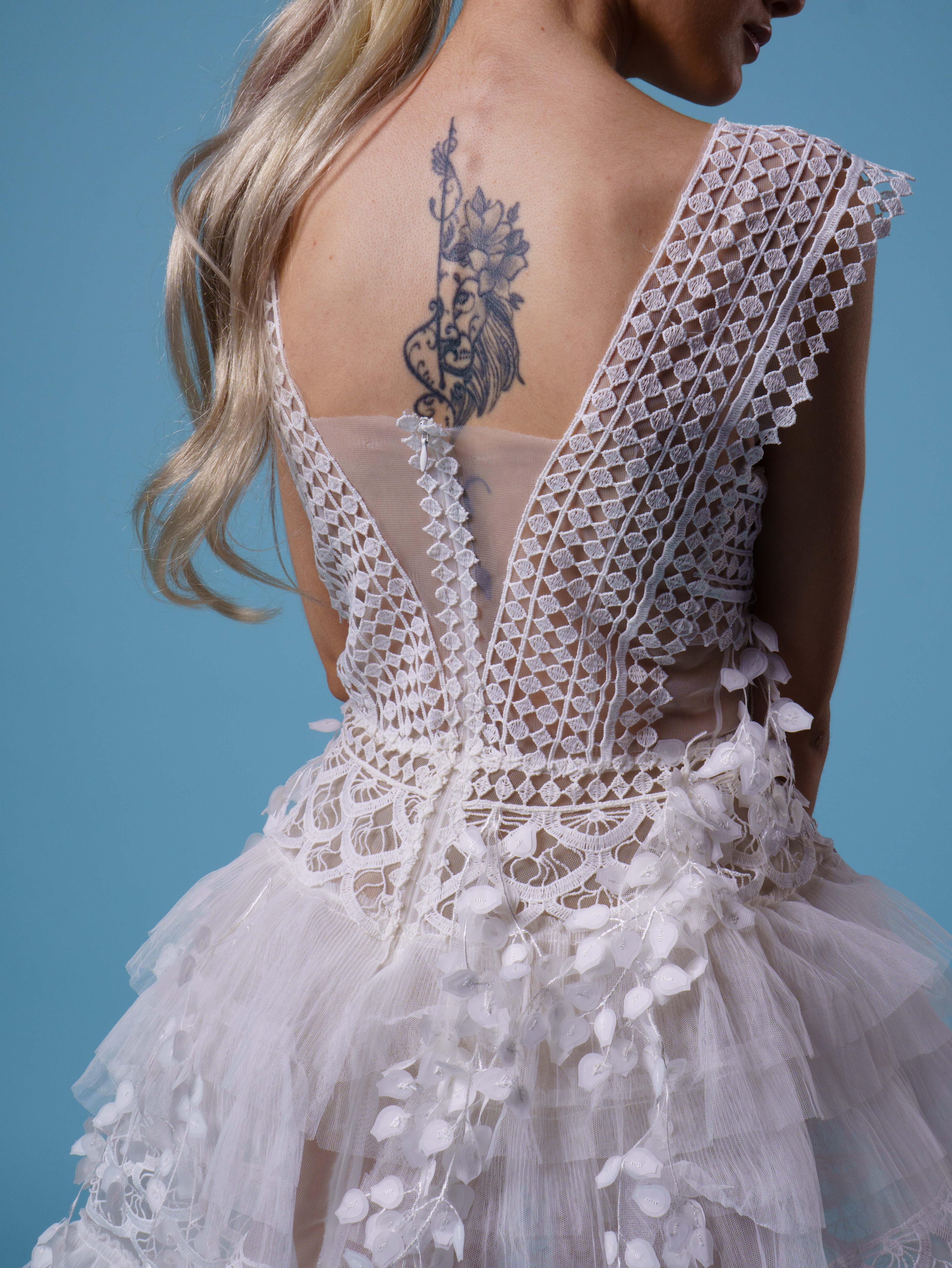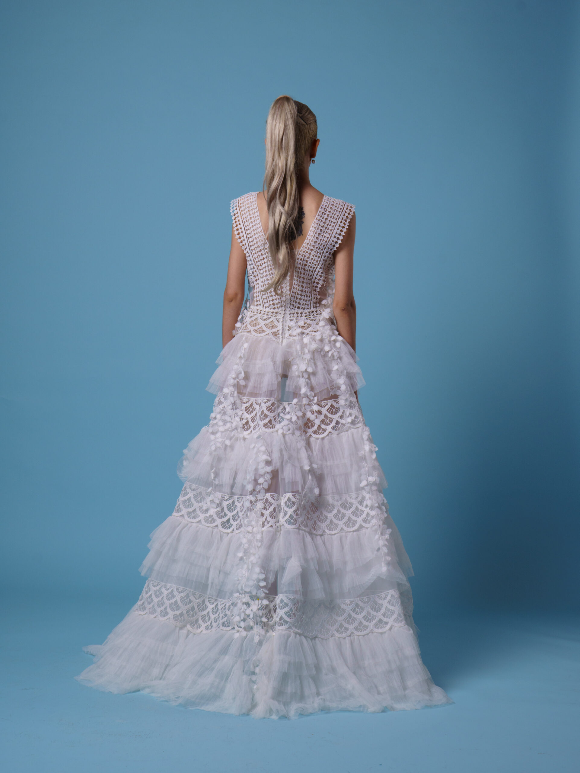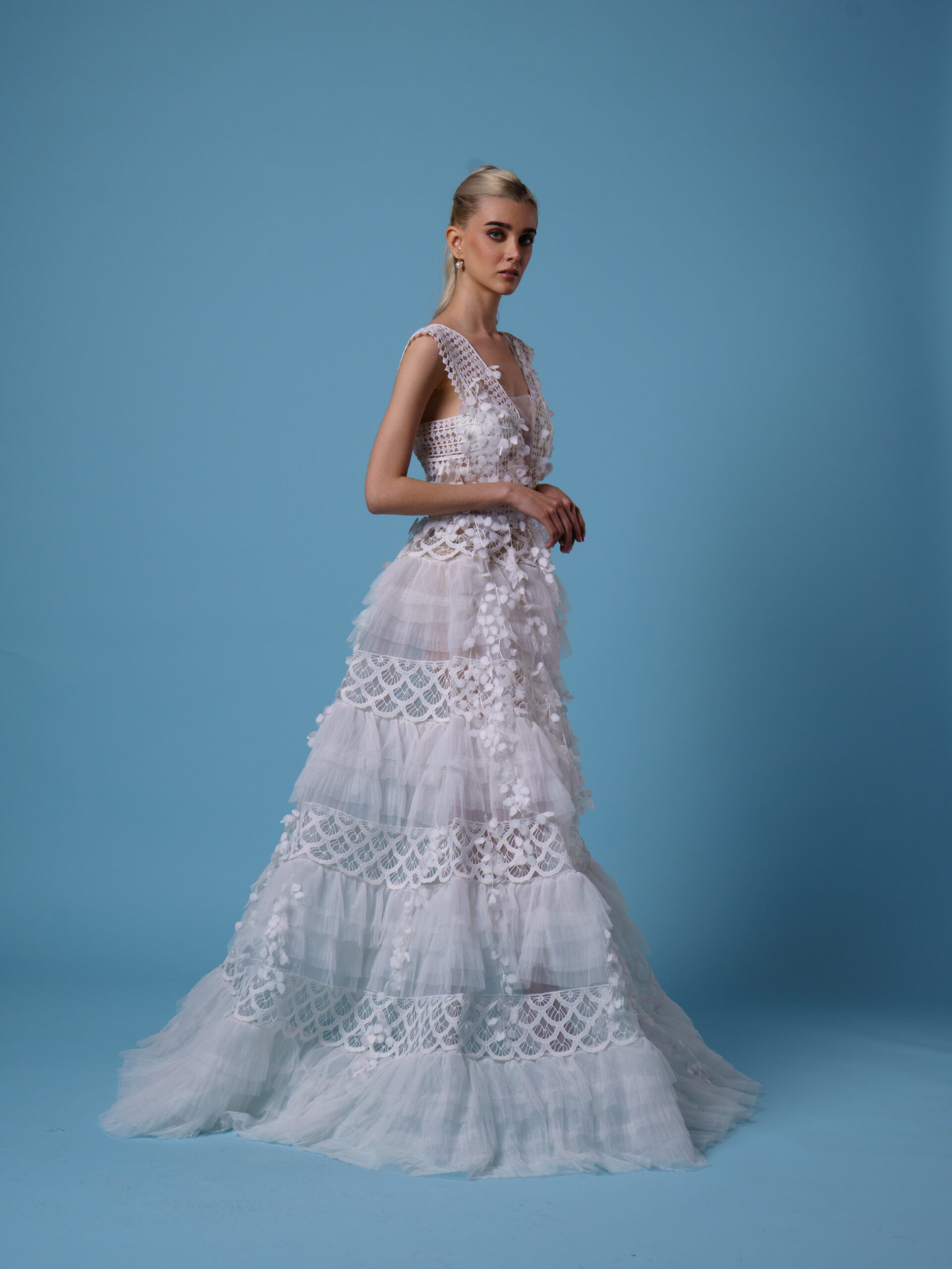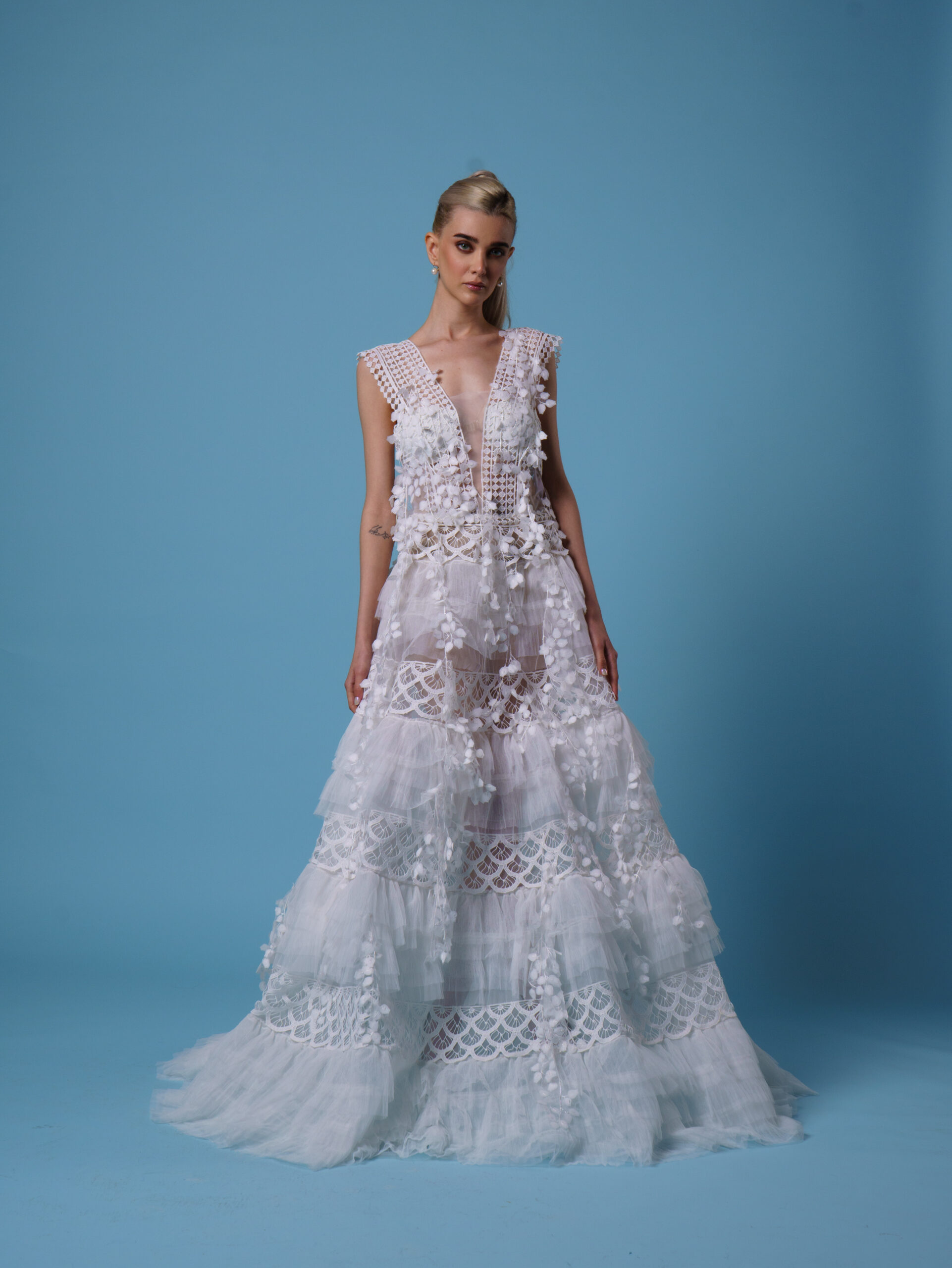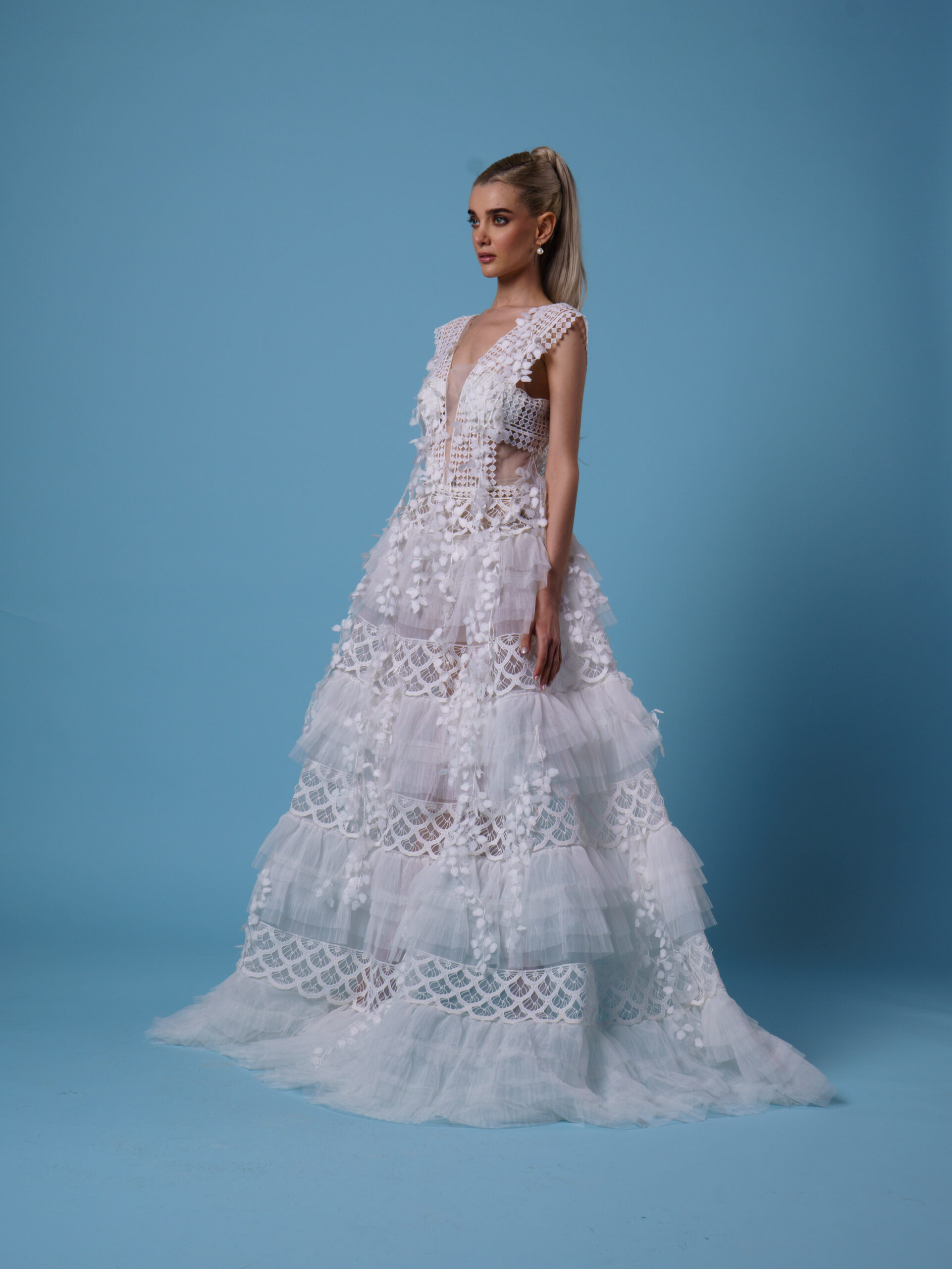 "Serephina" is a breathtaking symphony of lace, light, and liberated spirit. This gown combines a deeply feminine silhouette with a daring modern twist.