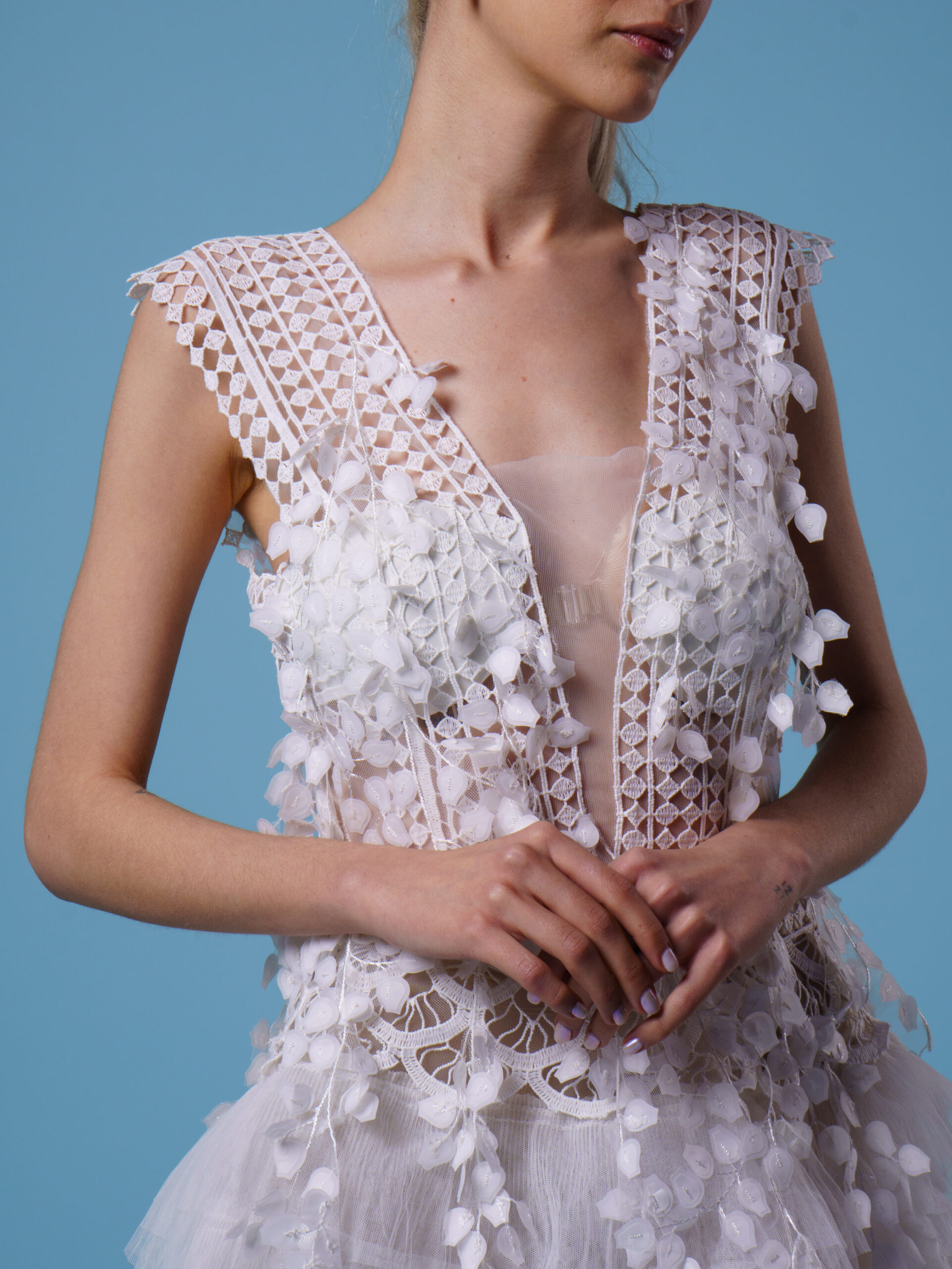 - Hand-woven crochet lace inserts