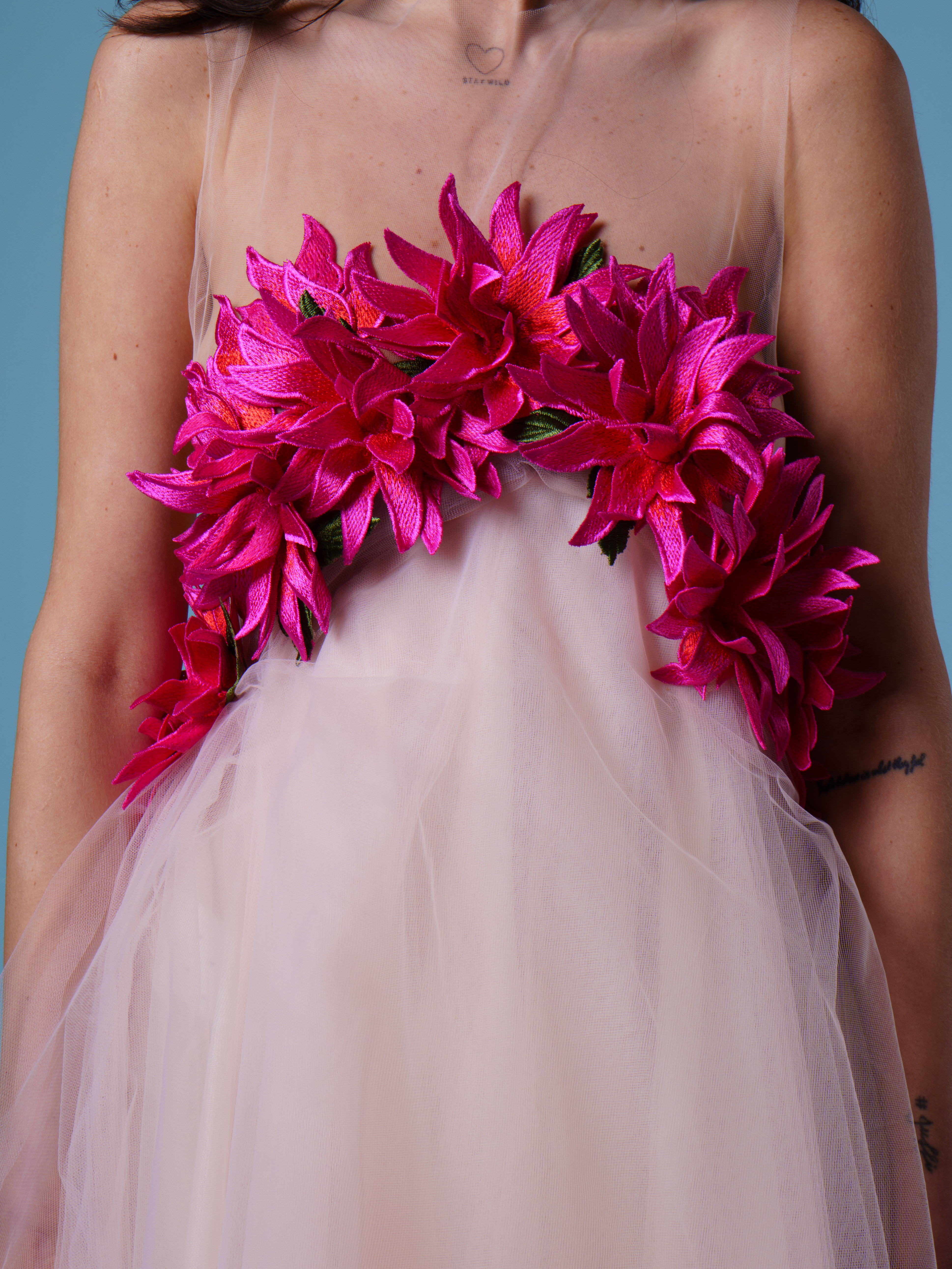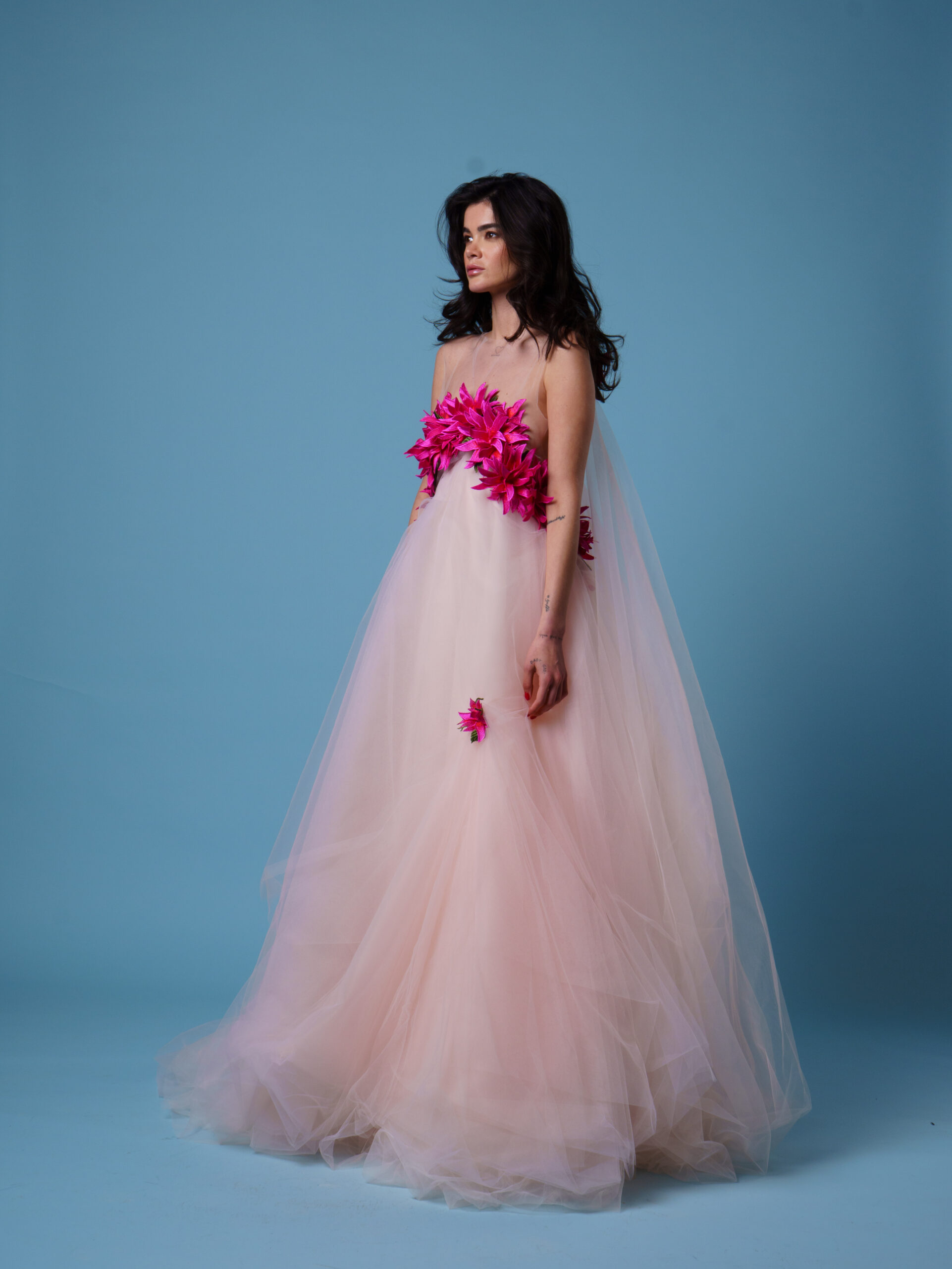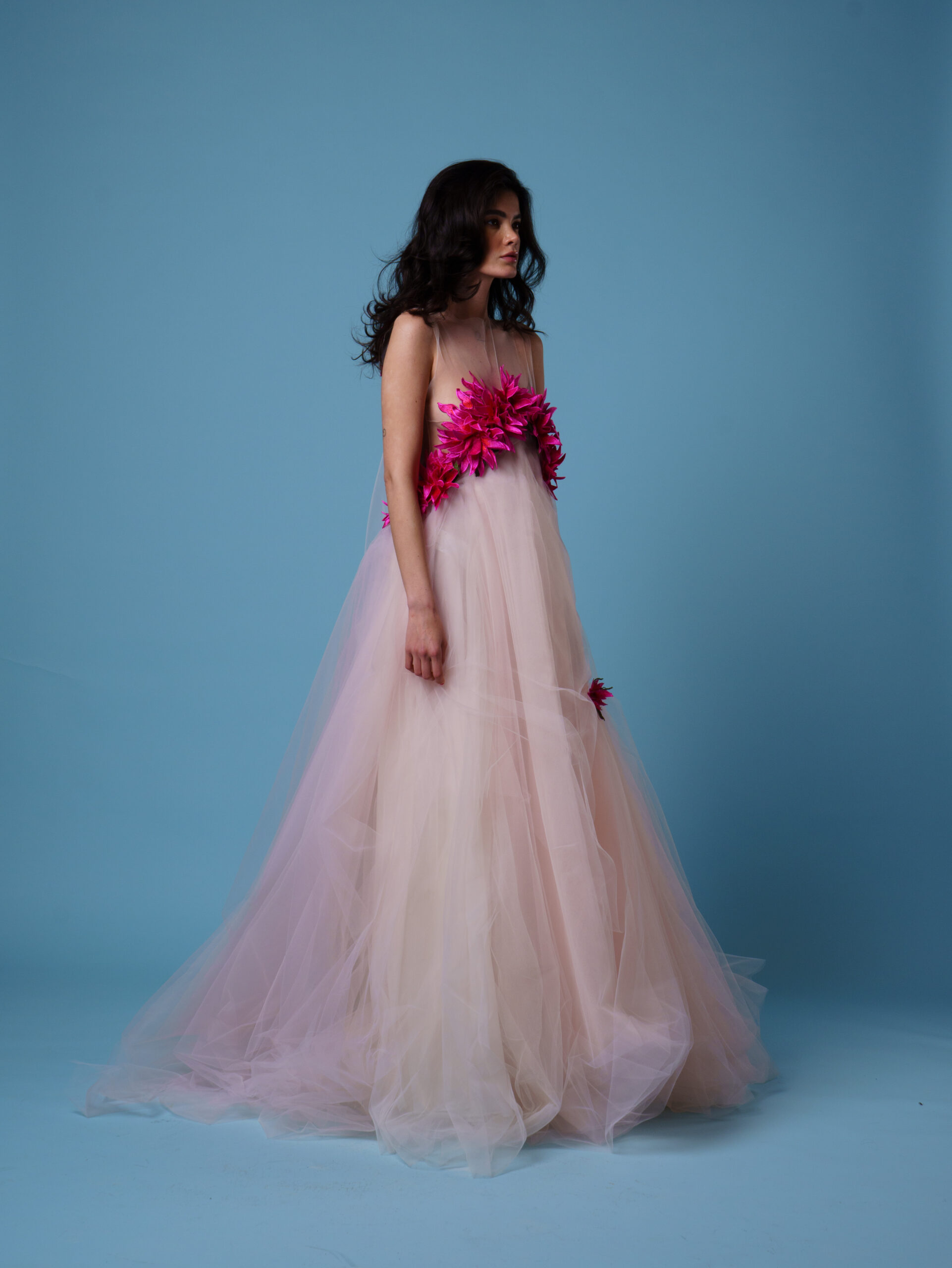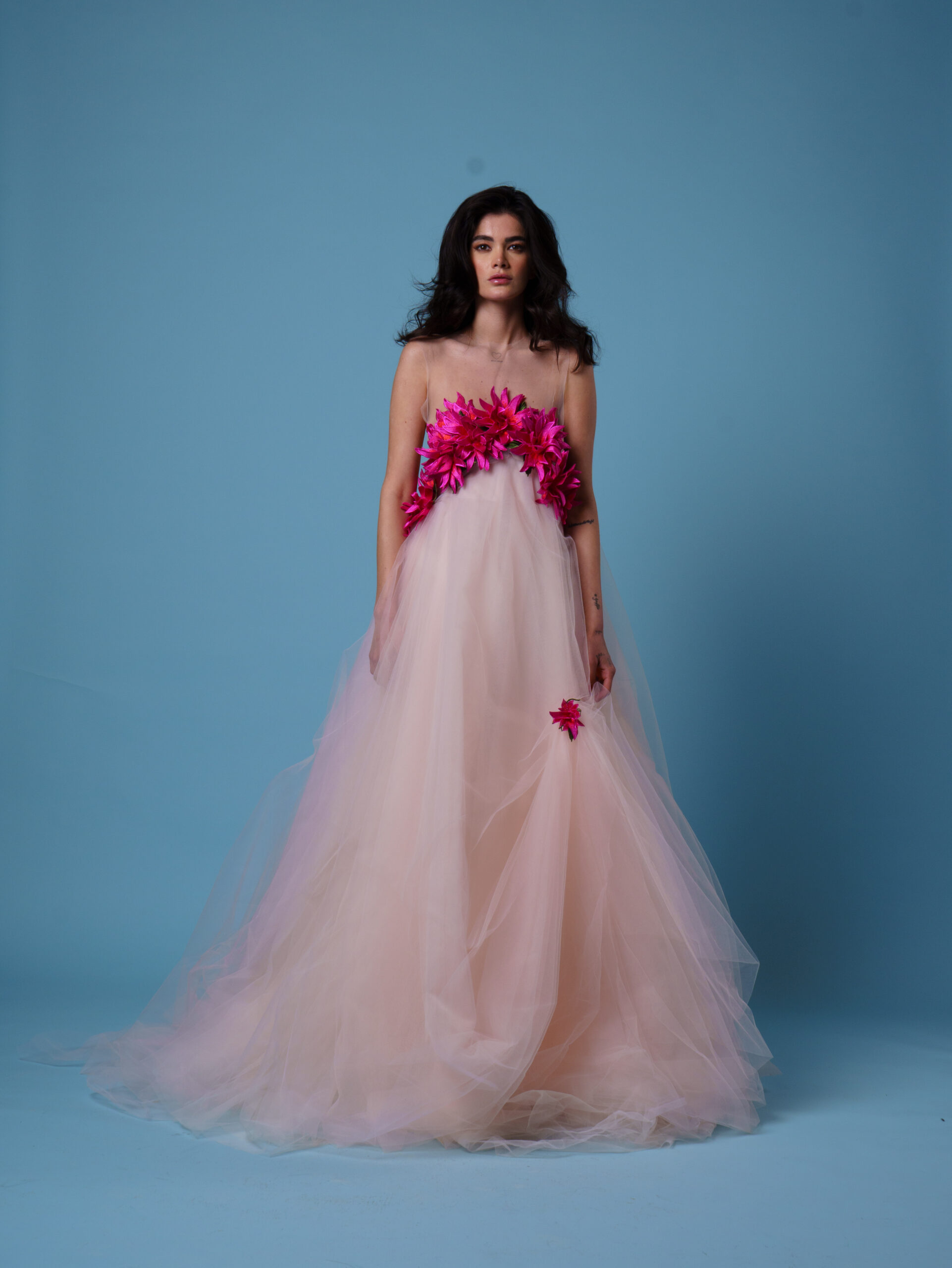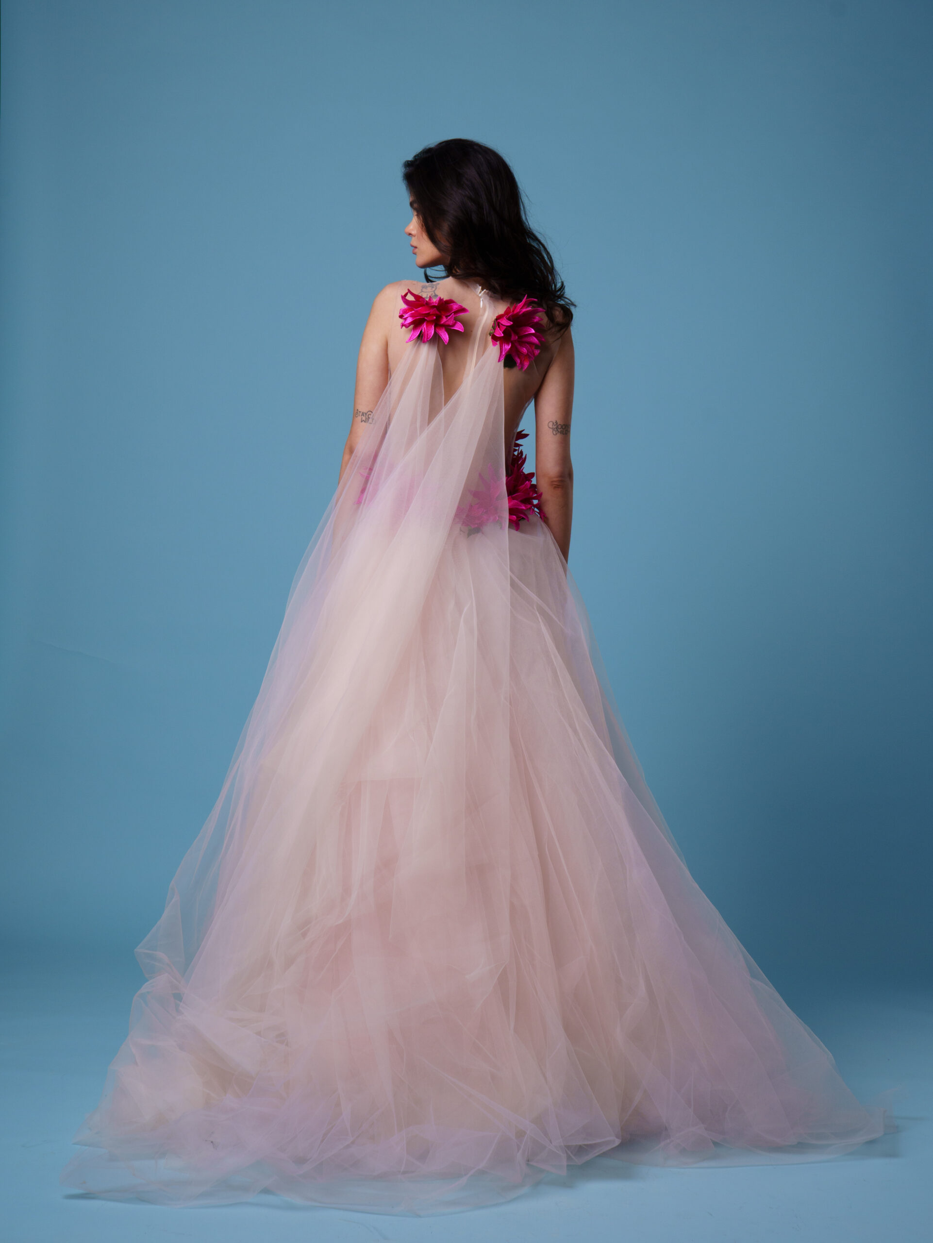 "Rosalie" is where romance meets art. This gown is an ethereal cascade of blush tulle, brought to life by vivid fuchsia floral appliqués that dance across the bodice like a garden in full bloom